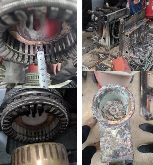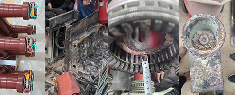 烧毁严重,触头表面全部变黑,动触头内部高温灼烧通红。造成局部面积停电,损失严重